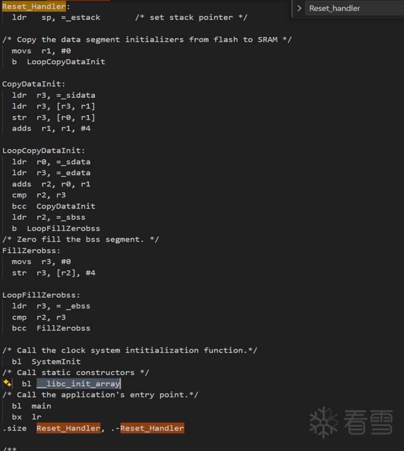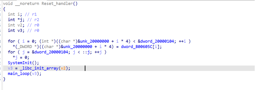 如下图所示,在入口点Reset_handler处,初始化了一些data段的数据: