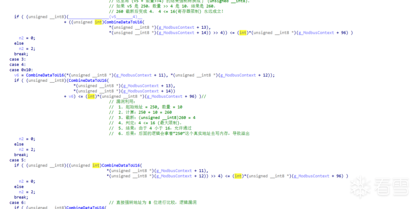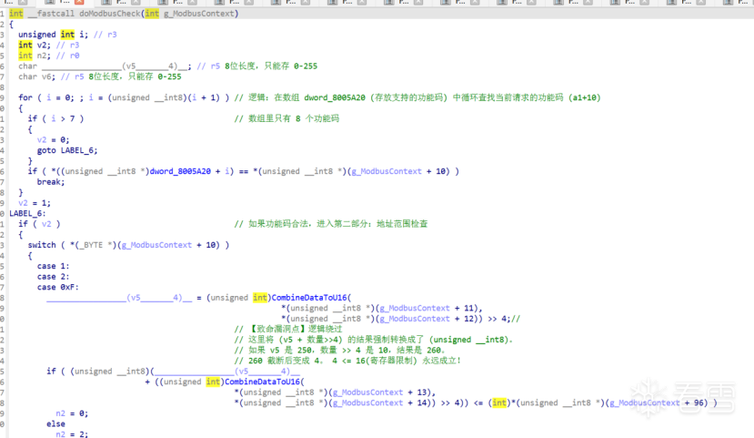 1.在doModbusCheck(sub_80007F0)中发现了对寄存器地址的校验存在漏洞,如下图: