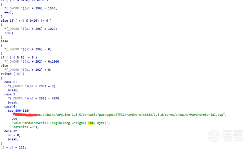 基本上可以确定出Reset_handler函数里边的符号。从而也确定了HardwareSerial_Begin的符号,可以知道HardwareSerial_Begin是一个初始函数,属于开源框架部分。剩下的就好分析了。