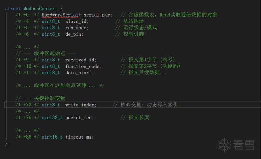 基于上述逆向证据,最终还原出的 ModbusContext 内存布局如下(省略了部分结构体成员的还原过程)如下图所示: