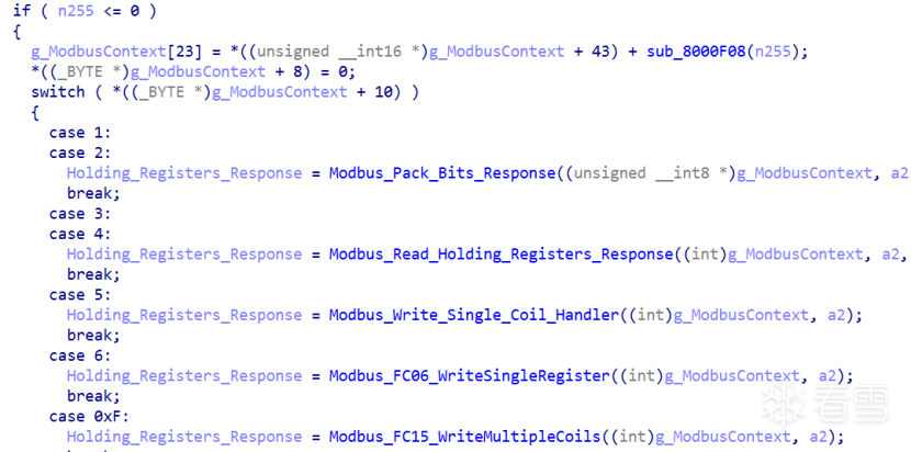 经过其上层函数确定,a2=1,而结合Modbus协议标准,确认此处为从站地址,默认值为1,从而确定Offset 4处的成员为Slave ID,观察到该偏移量Offset 6被传入pinMode和digitalWrite函数,推断其为控制某个部件收发切换的硬件引脚号。Offset 86应该为某个频率或者时间。Offset 10如下图控制着switch case中跳转,符合Modbus PDU格式中功能码的位置,如下图所示: