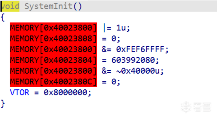 由于本人在写分析过程时,固件已经分析完毕,大部分符号基本上是基于我自己的理解打上去的,除了Reset_Handler、NMI_Handler这种与中断相关自带符号,其他函数基本上不带符号,Reset_handler大部分符号我已经还原。首先进入SystemInit,如下图: