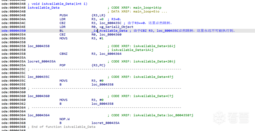 如果dword_20000120为0,则将会执行svc指令,但是dword_20000120除了在Reset_handler中被初始化为0,无论实在init_arrary函数中,都未曾有过修改,故syscall_3f必然执行,而SVC的处理函数对应的是NMI_handler,这是一个死循环函数,程序执行到这一步将会卡死。至此发现了第一个漏洞点。