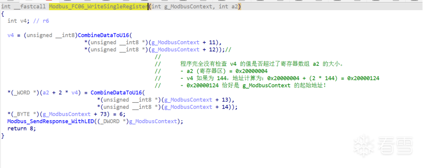 4.在Modbus_FC06_WriteSingleRegister(sub_8000A4E)中存在越界写入内存的漏洞(缓冲区溢出),如下图: