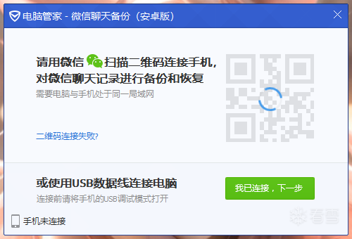 用旧版本腾讯手机管家可以连接到手机 但是 微信聊天备份 无法连接手机 都检查不到手机