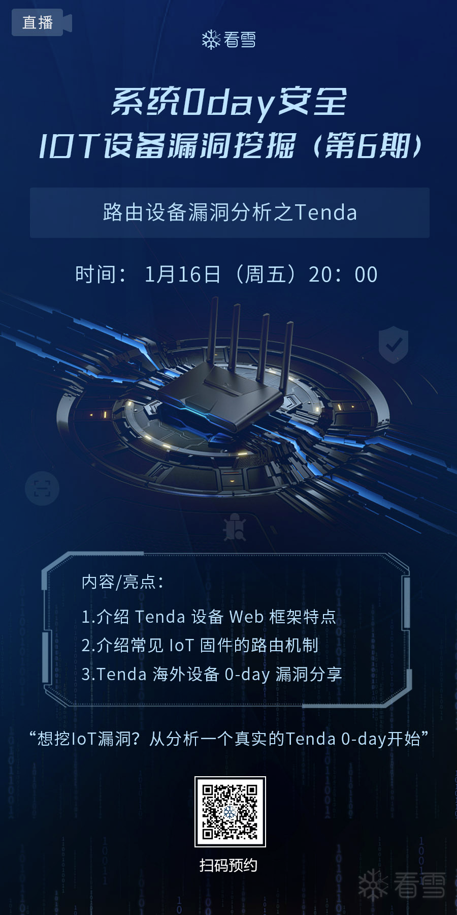 直播预约 | 路由设备漏洞分析之Tenda,本周五20点,看雪视频号见