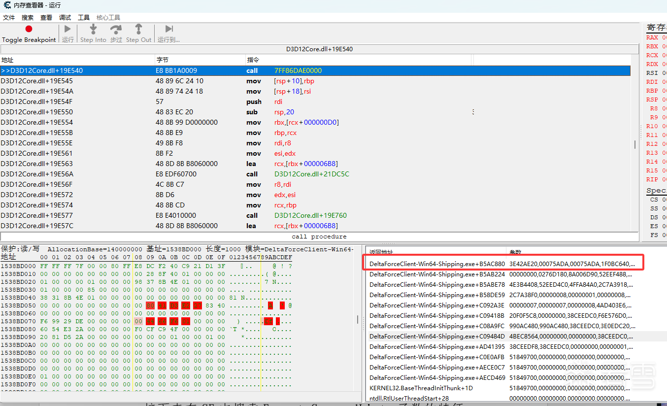 接下来在CE中搜索ExecuteCommandLists函数的特征码,定位到这个函数的头部下断,查看堆栈返回。