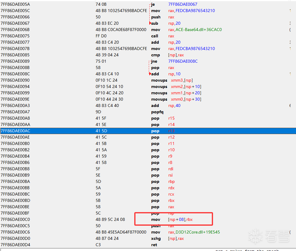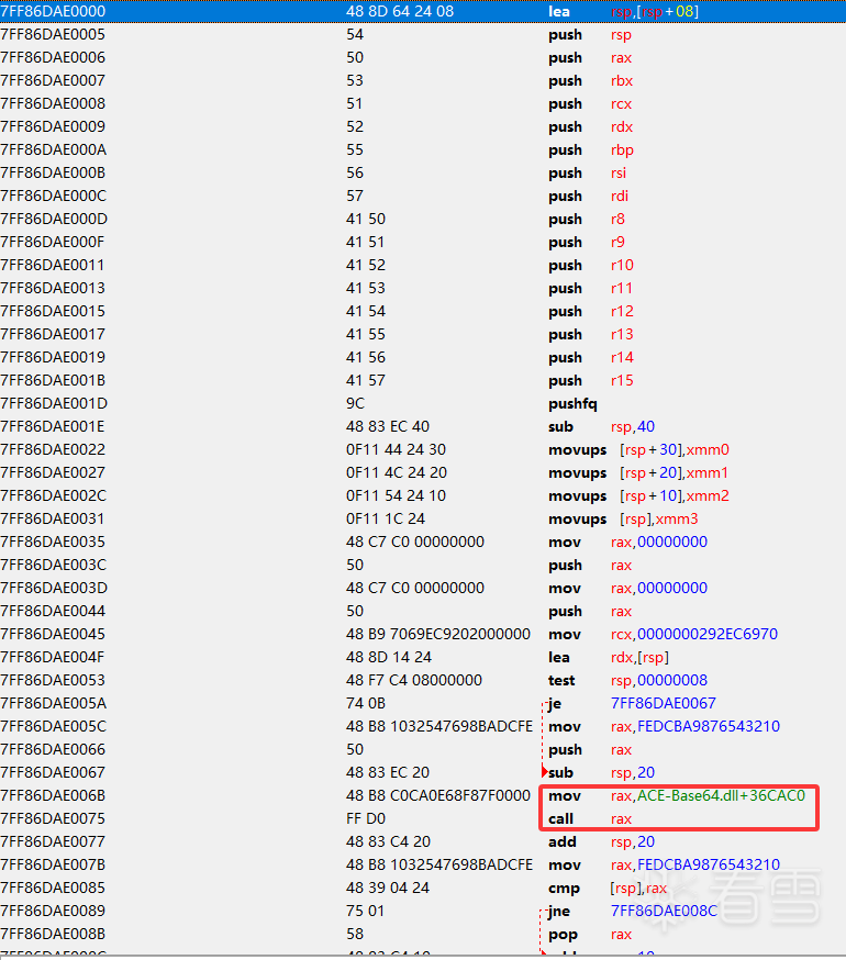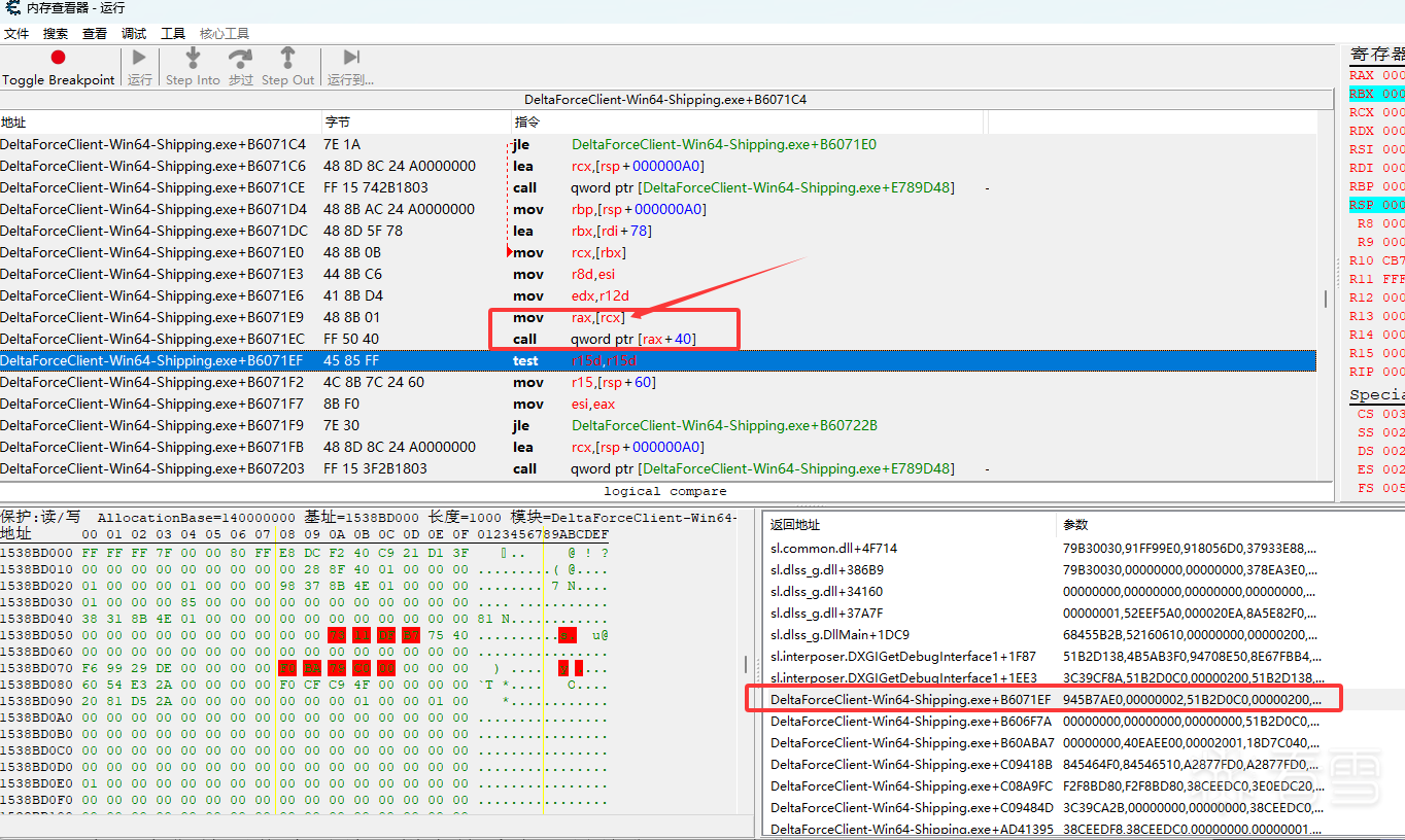 这种堆栈是很常见的开启了GPU加速以及超分辨率模式,我们就不能像以前一样直接看上一层的代码了,我们需要直接定位到他返回到主模块的地址。你更换不同的超分辨模式这里加载的dll就是其他名称了,思路都是一样的直接找到主模块下的返回地址。漫xx雄与界xx潮都是一样的处理方式。