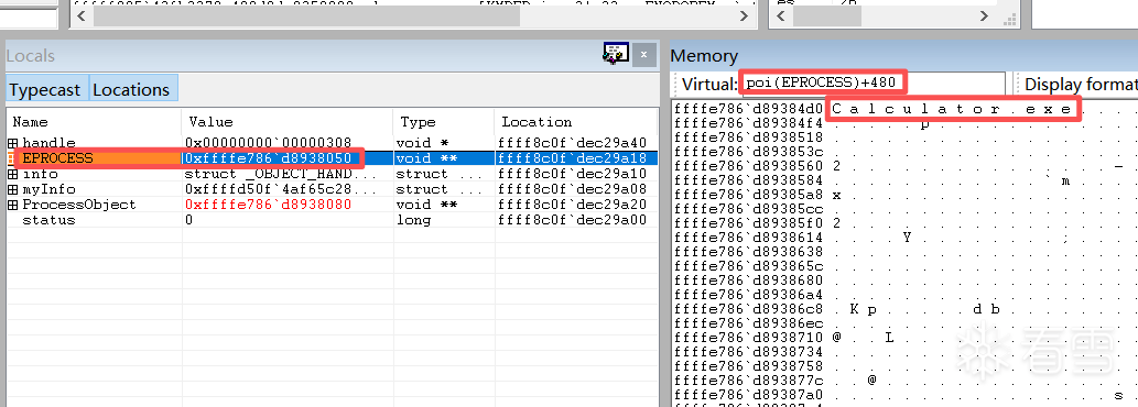验证ProcessObject可以发现+0x480的位置刚好就是ImageFileName, 说明这就是EPROCESS对象