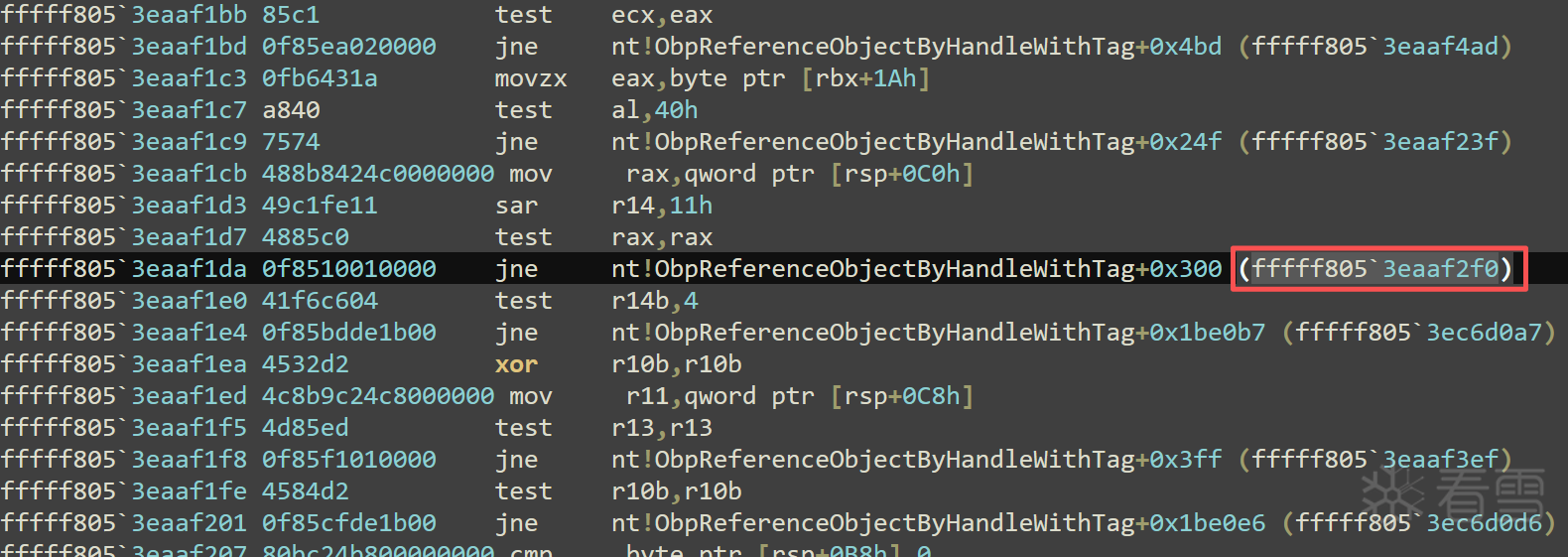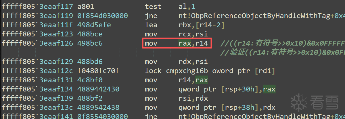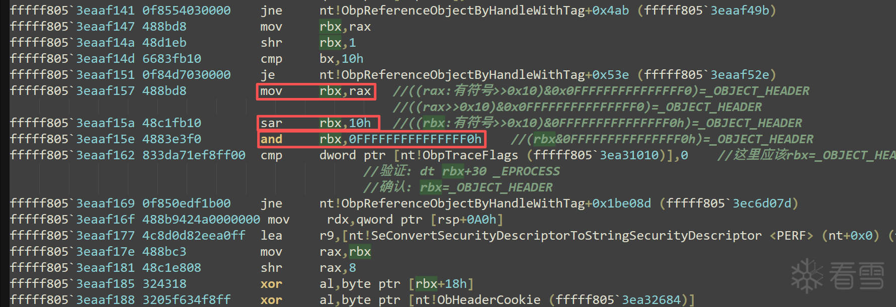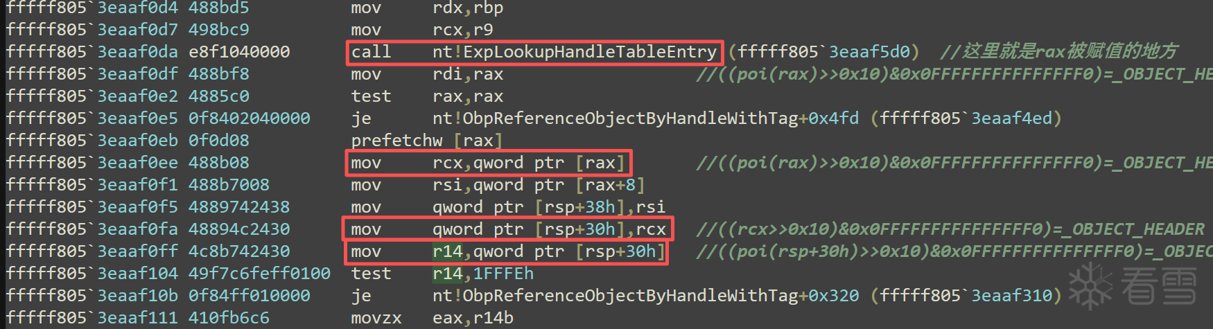 继续跟踪得知r14来自[rsp+30], [rsp+30]又来自rcx, rcx又来自[rax], 而rax来自call nt!ExpLookupHandleTableEntry, 经过上面分析ExpLookupHandleTableEntry得知[rax]+8=OBJECT_HANDLE_INFORMATION, 而对于EPROCESS则是用的[rax], 于是可以反解出算法为((poi(rax)>>0x10)&0x0FFFFFFFFFFFFFFF0)=_OBJECT_HEADER