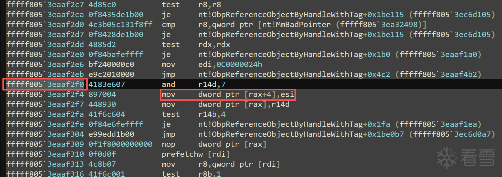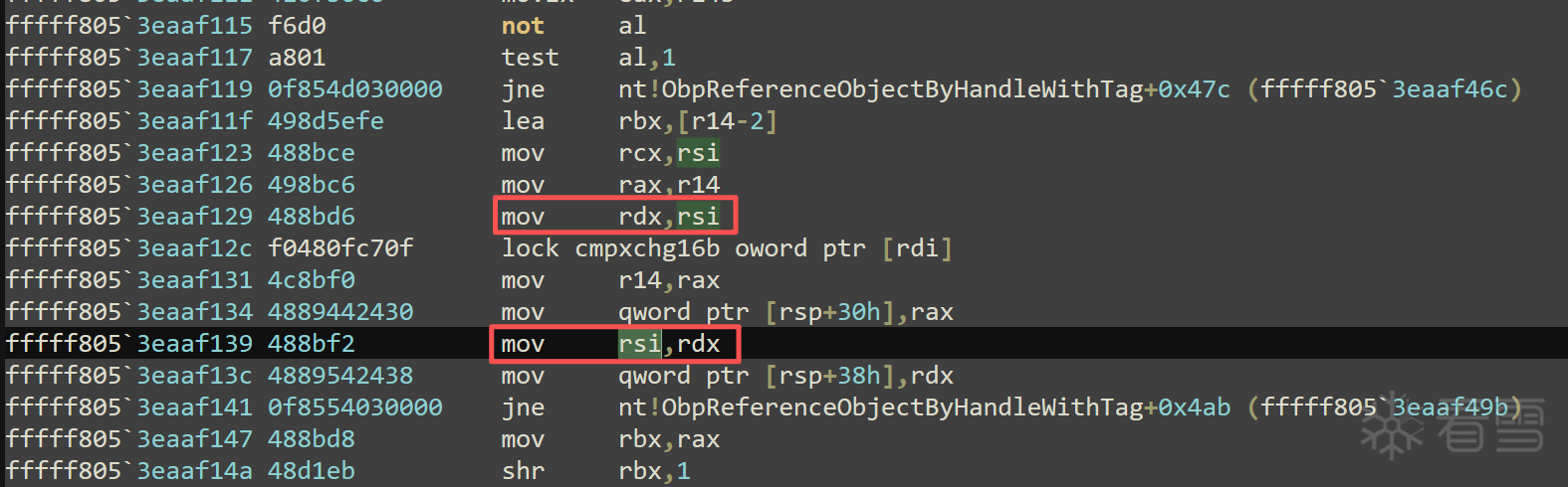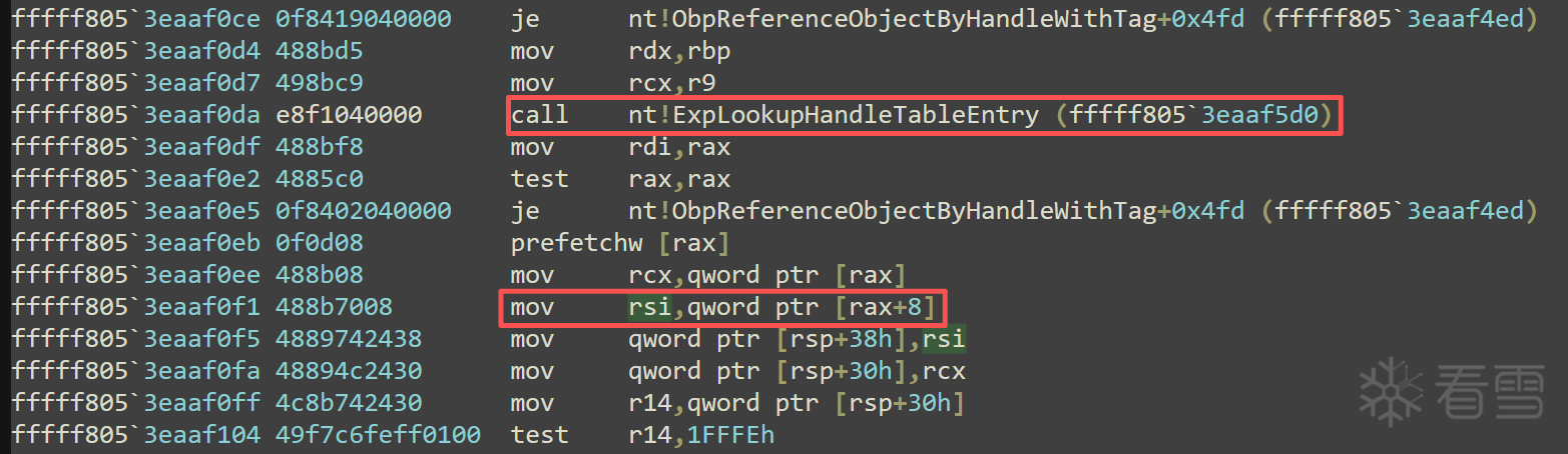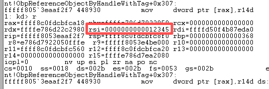 在这里发现rsi被rdx赋值, 然后又回到了rsi, 继续向上跟踪发现rsi来自[rax+8], 继续向上发现rax是来自nt!ExpLookupHandleTableEntry
