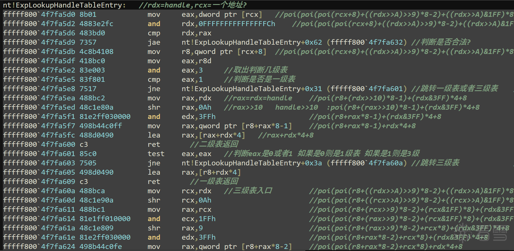 分析nt!ExpLookupHandleTableEntry可以发现这就是取句柄信息的核心算法, 首先判断传入句柄是否合法, 其次根据句柄表后2位判断是几级结构的句柄表, 共有三个层次