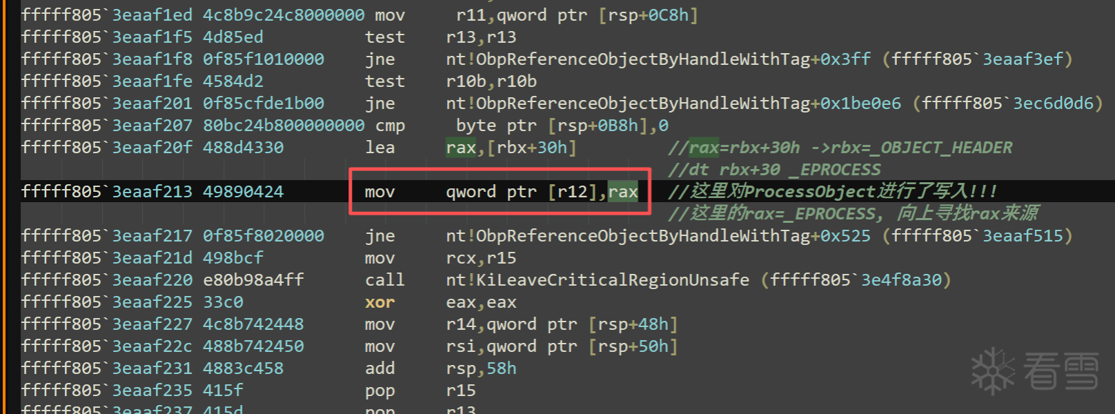 可以发现断点被触发, 在mov qword ptr [r12],rax对ProcessObject进行了写入, 明显当前r12=ProcessObject=EPROCESS, 继续向上跟踪发现rax被lea rax,[rbx+30h]赋值, 知道EPROCESS-30刚好就回到了_OBJECT_HEADER头部, 所以rbx=_OBJECT_HEADER, 需要继续向上跟踪rbx的由来...