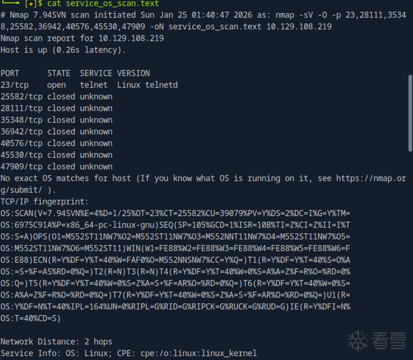nmap -sV -O -p 23,28111,35348,25582,36942,40576,45530,47909 -oN service_os_scan.text 10.129.108.219 #-sV:探测服务版本(如 “Apache 2.4.49”“OpenSSH 8.2p1”); #-O:探测操作系统(可能显示 “VMware Virtual Platform”“Linux 5.4.x (VirtualBox)” 等