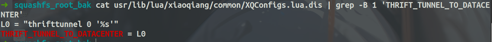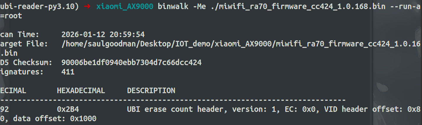 binwalk -Me ./miwifi_ra70_firmware_cc424_1.0.168.bin --run-as=root cd _miwifi_ra70_firmware_cc424_1.0.168.bin.extracted ubireader_extract_images ./2B4.ubi //然后解出三个.ubifs文件 //对其中的xxx-ubi_rootfs.ubifs用binwalk再解开,即可得到里面的SquashFS文件系统,也就是核心部分 binwalk -Me ./img-870537086_vol-ubi_rootfs.ubifs --run-as=root