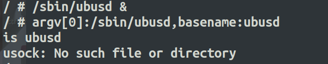 接着,会报错Failed to connect to ubus,很显然这里是用到了ubus总线通信,我们需要启动/sbin/ubusd &。但是,接下来又继续报错usock: No such file or directory,但是并没有给出缺失哪个文件,因此我们需要将ubusd拖进IDA定位一下报错点。