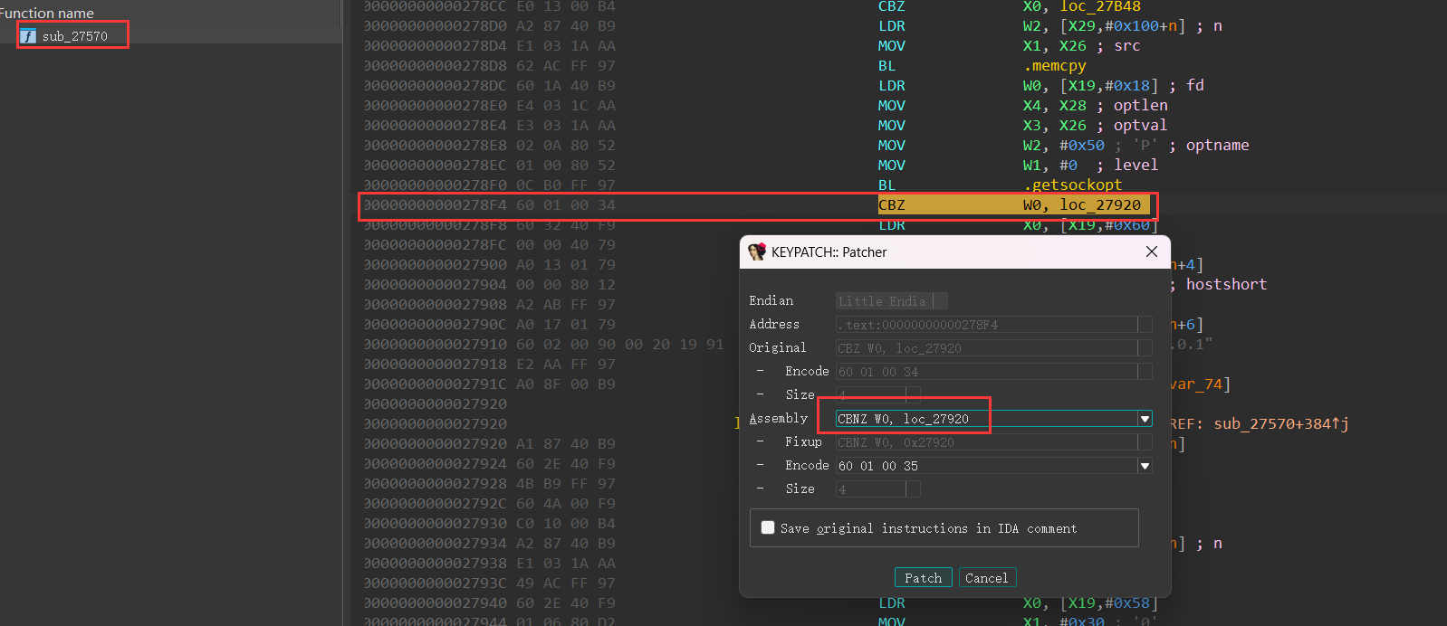 patch的文件为/squashfs-root/usr/sbin/sysapihttpd找到如图所示部分进行修改将CBZ 修改为 CBNZ