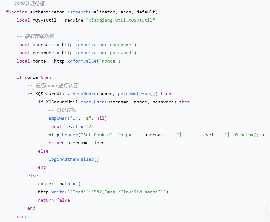 通过分析可以确定身份验证文件是/usr/lib/lua/luci/dispatcher.lua的jsonauth函数中.checkUser函数根据从POST报文中获取的username,password和nonce(现时)字段进行身份验证。