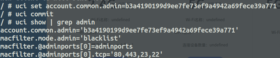 那么我们可以用uci set account.common.admin命令将配置文件中的密码设置为 sha1(admina2ffa5c9be07488bbb04a3a47d3c5f6a)(密码+key)。