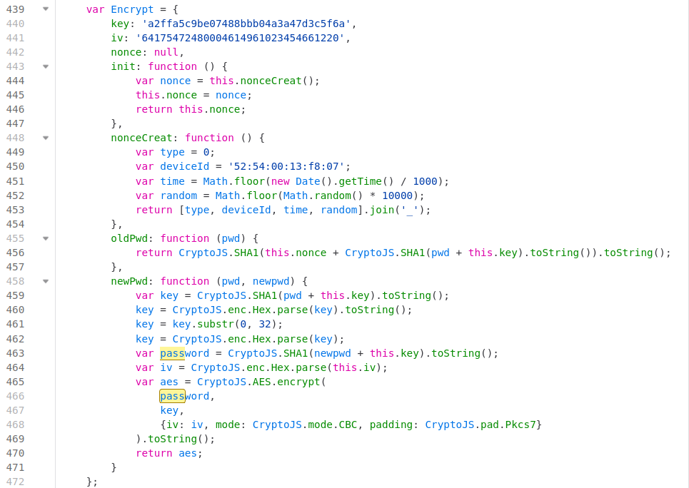 第一处是这个Encrypt函数.这里定义了Key和iv,然后对密码的操作,对于oldPwd就是nonce和输入的pwd进行SHA1后拼接起来在进行SHA1.