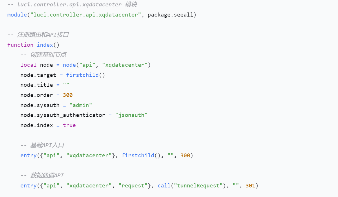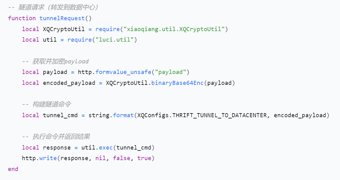 在反编译的/usr/lib/lua/luci/controller/api/xqdatacenter.lua中,可以看到 URL /api/xqdatacenter/request相关的handler函数是tunnelRequest函数,且是需要鉴权通过的。