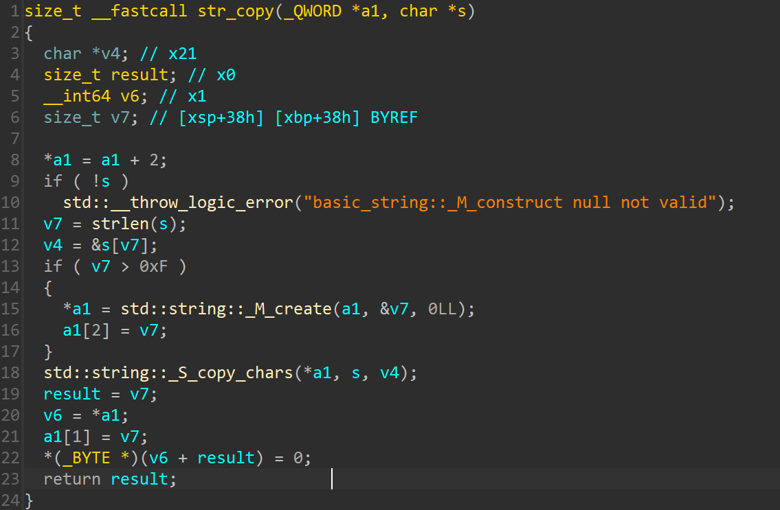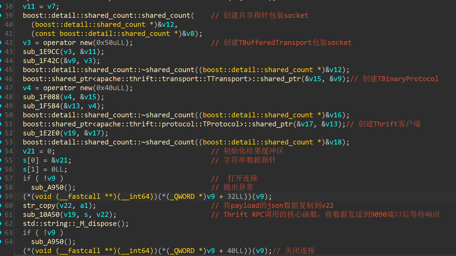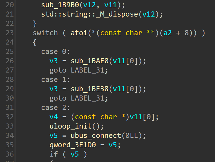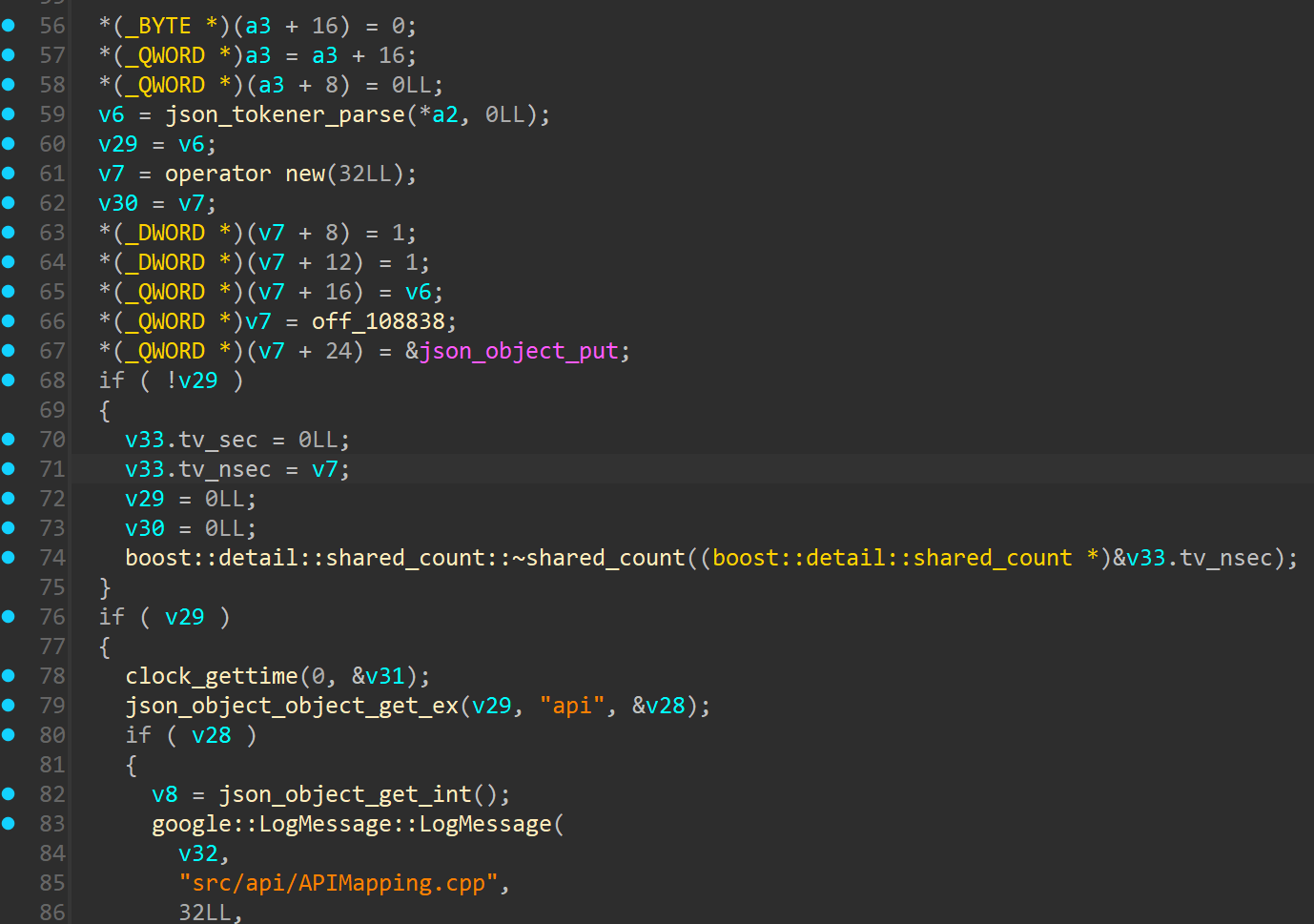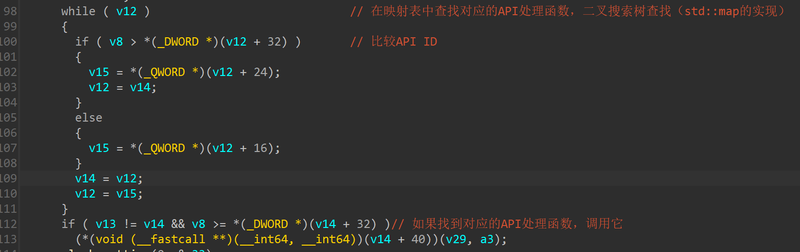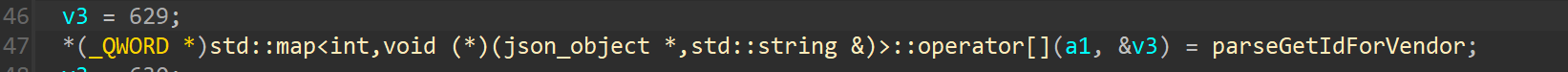 其中,先获取了Json对象中的api字段的值,存放在v8变量中,然后经历了一个for循环,其中有对v8值的判断比较,最后执行了一个函数指针。这里需要稍微解释一下,此处的a1就是上面建立的map映射表,类型是std::map<int,void (*)(json_object *,std::string &)>,即第一个元素(键值)是整数,第二个元素(实值)是函数指针。所以此处的for循环就是对map的操作,但是都是用的偏移值,不好看出来具体是什么,其实这里也没必要去查源码,我们直接自己写一个map容器的遍历,然后静态编译出来,反编译后这些偏移值的含义也就都清楚了。此处的for循环其实就是执行了map.find()的操作,寻找了map中key为v8(即api值)的迭代器,偏移+32就是第一个键值元素(api值),偏移+40则是第二个实值元素(handler的函数指针)。显然,此处就是根据传入的api字段值调用对应的handler的过程。到这里,上述建立的Mapping Table中的映射关系也更加明朗了。