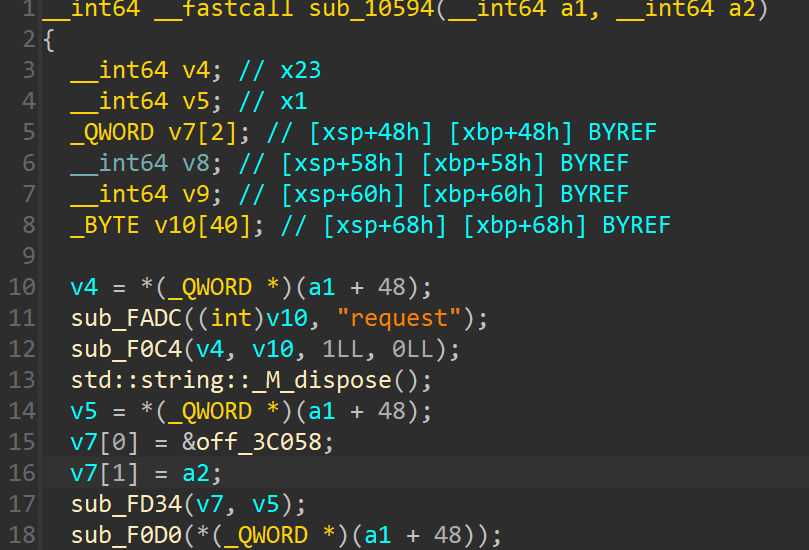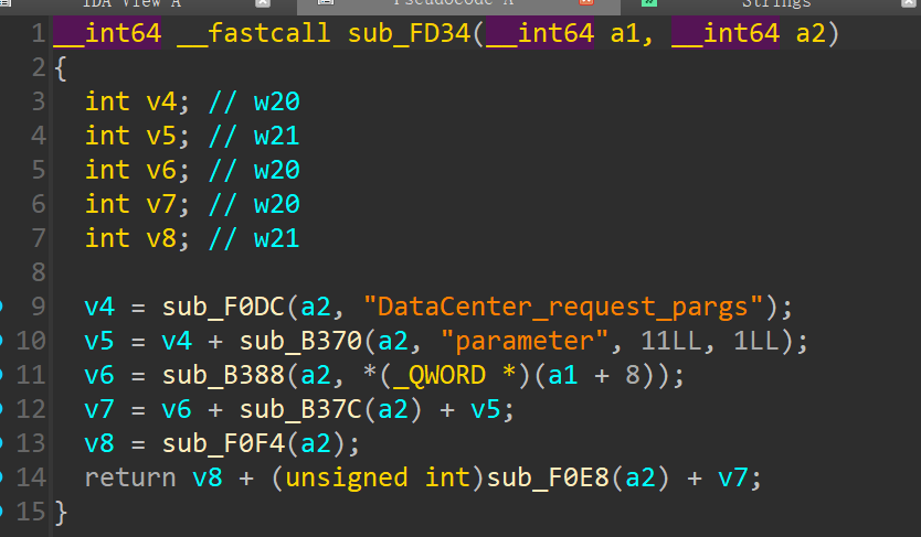 其中sub_FD34(v7, v5);函数中,可以看到DataCenter_request_pargs,