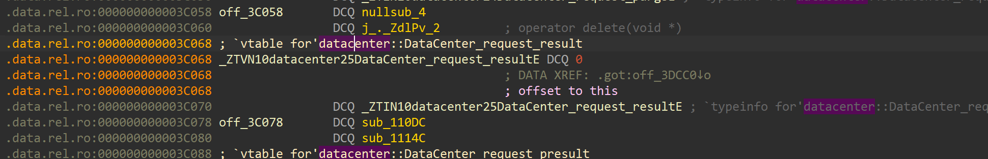 然后在off_3C058中也能看到很多关于datacenter的虚表,猜测datacenter就是接收我们发送数据的程序。