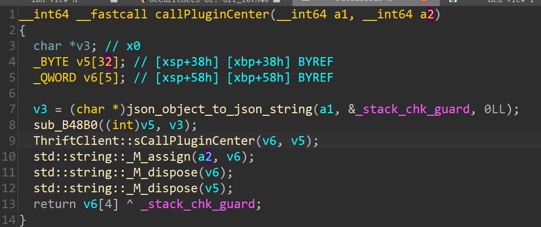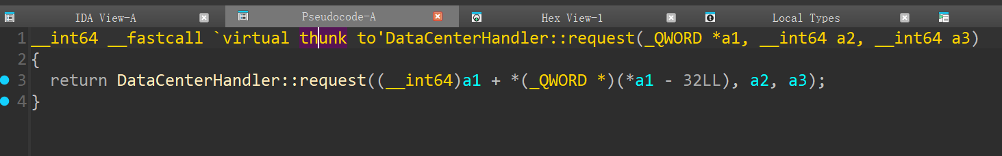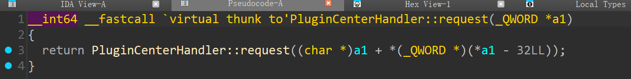 在datacenter中同样也是向plugincenter发送请求,所以按照上面同样的思路尝试去搜索request,找到__int64 __fastcall virtual thunk to'PluginCenterHandler::request(_QWORD *a1)