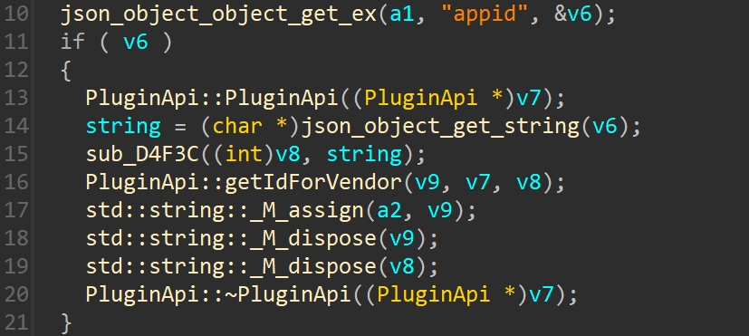 查看该函数,首先从JSON对象中获取名为"appid"的字段,如果有appid字段就会进入if里面,然后创建PluginApi对象(存储在v7中),将JSON数据转换成String类型,sub_D4F3C是将转换后的string数据复制到v8,然后就会走到PluginApi::getIdForVendor函数处。