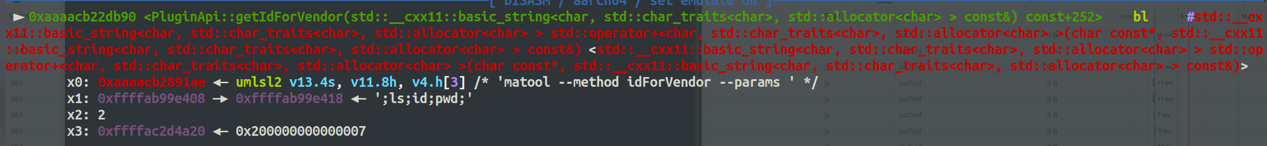 当执行到std::operator+<char>("matool --method idForVendor --params ", a1);时,会将appid的数据拼接到 --params后面,然后再调用CommonUtils::sCallSystem(v15, v13);执行命令。