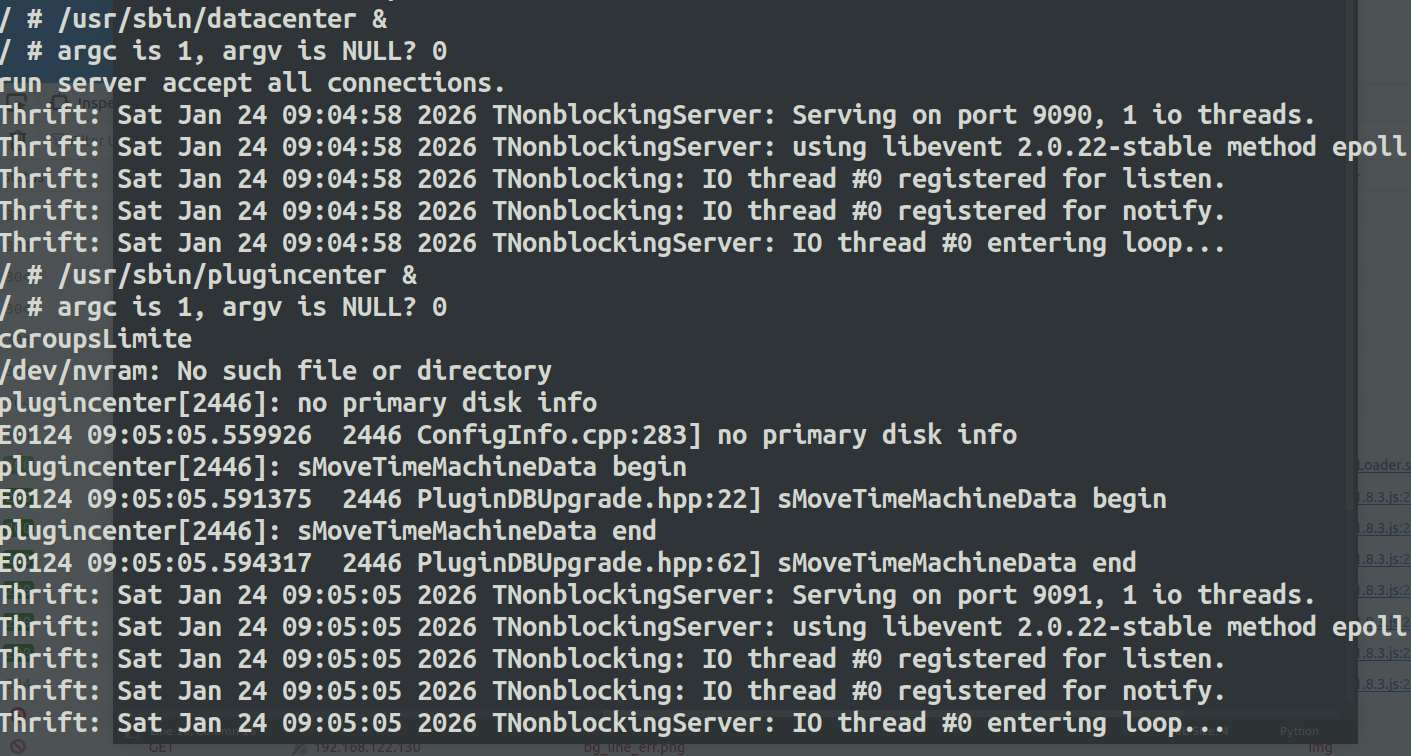 根据openwrt的内核初始化流程,按理说应该先启动/etc/preinit,其中会执行/sbin/init进行初始化,但是在这套固件仿真的时候,这样会导致qemu重启,所以我们首先先执行/sbin/init中最重要的/sbin/procd &,启动进程管理器即可。