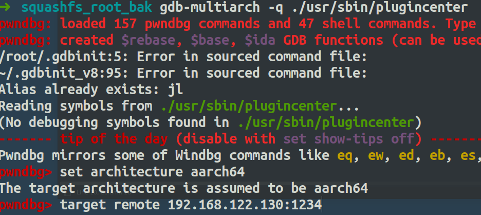 可以看到成功监听了1234端口,然后我们回到本机,用gdb-multiarch -q ./usr/sbin/plugincenter去调试