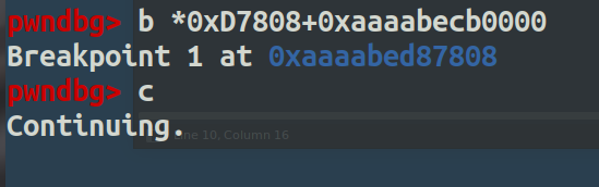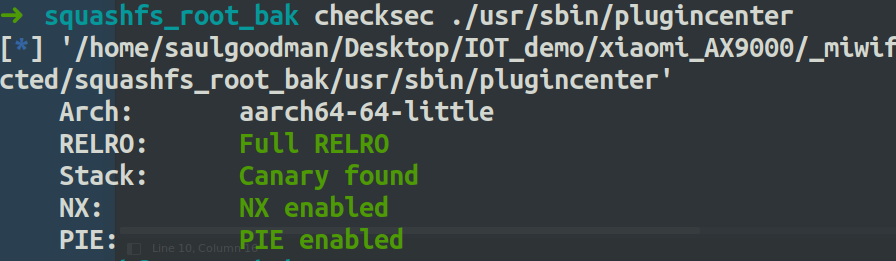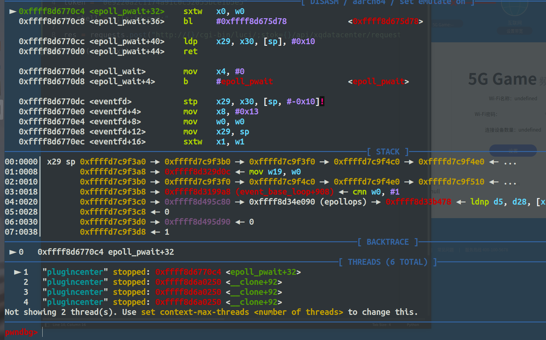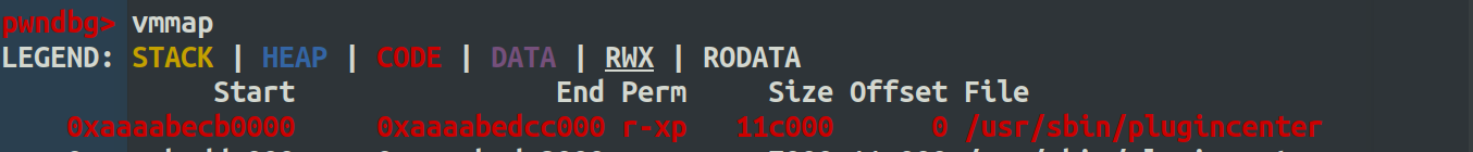 如上图可以看到,已经可以调试了,然后由于/usr/sbin/plugincenter保护是全开的,所以下断点的时候要知道基地址。