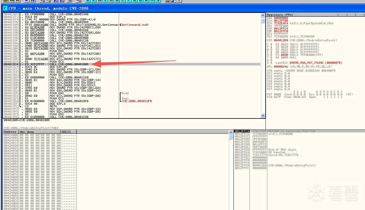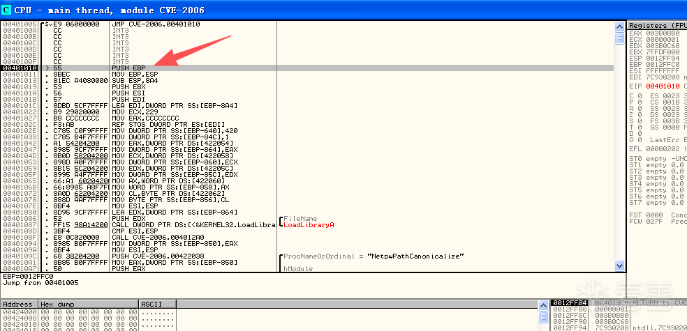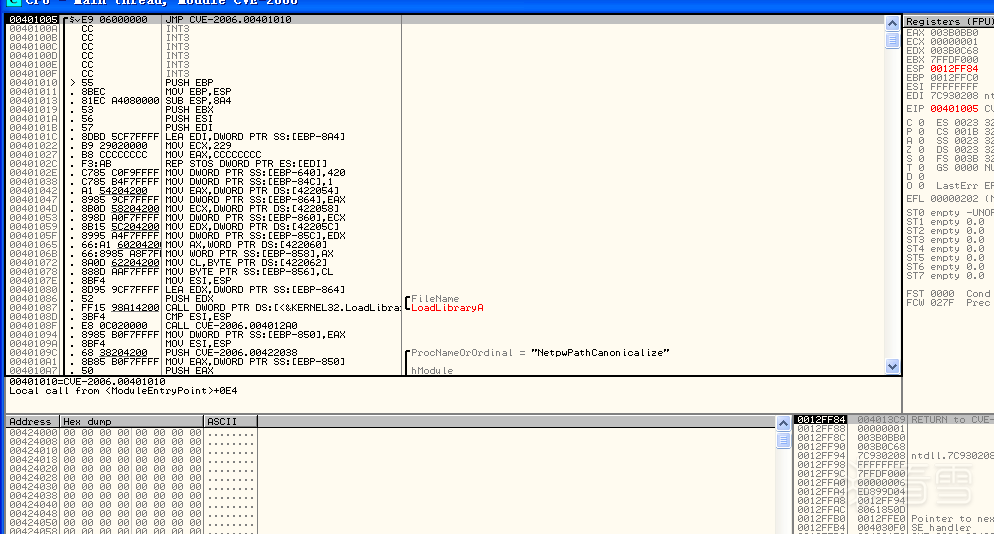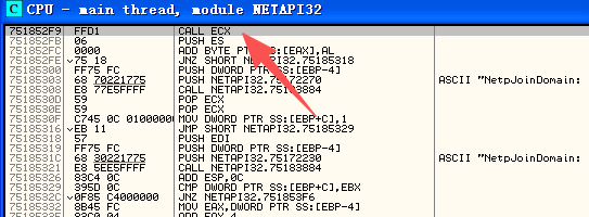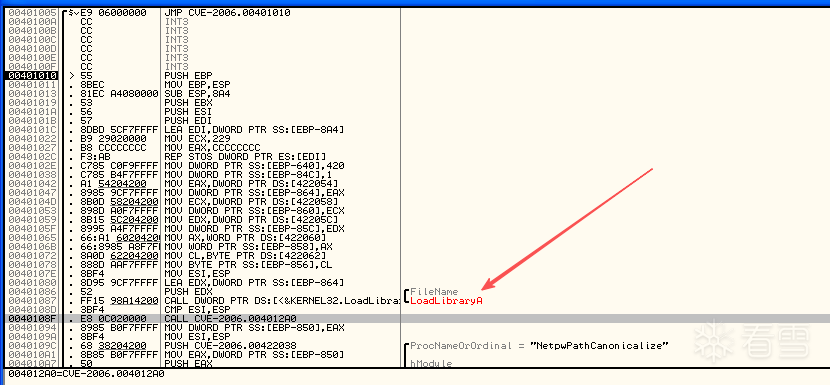 然后就加载进来了,然后跳到 NetpwPathCanonicalize(如果没执行loadlibrary是没法跳转的