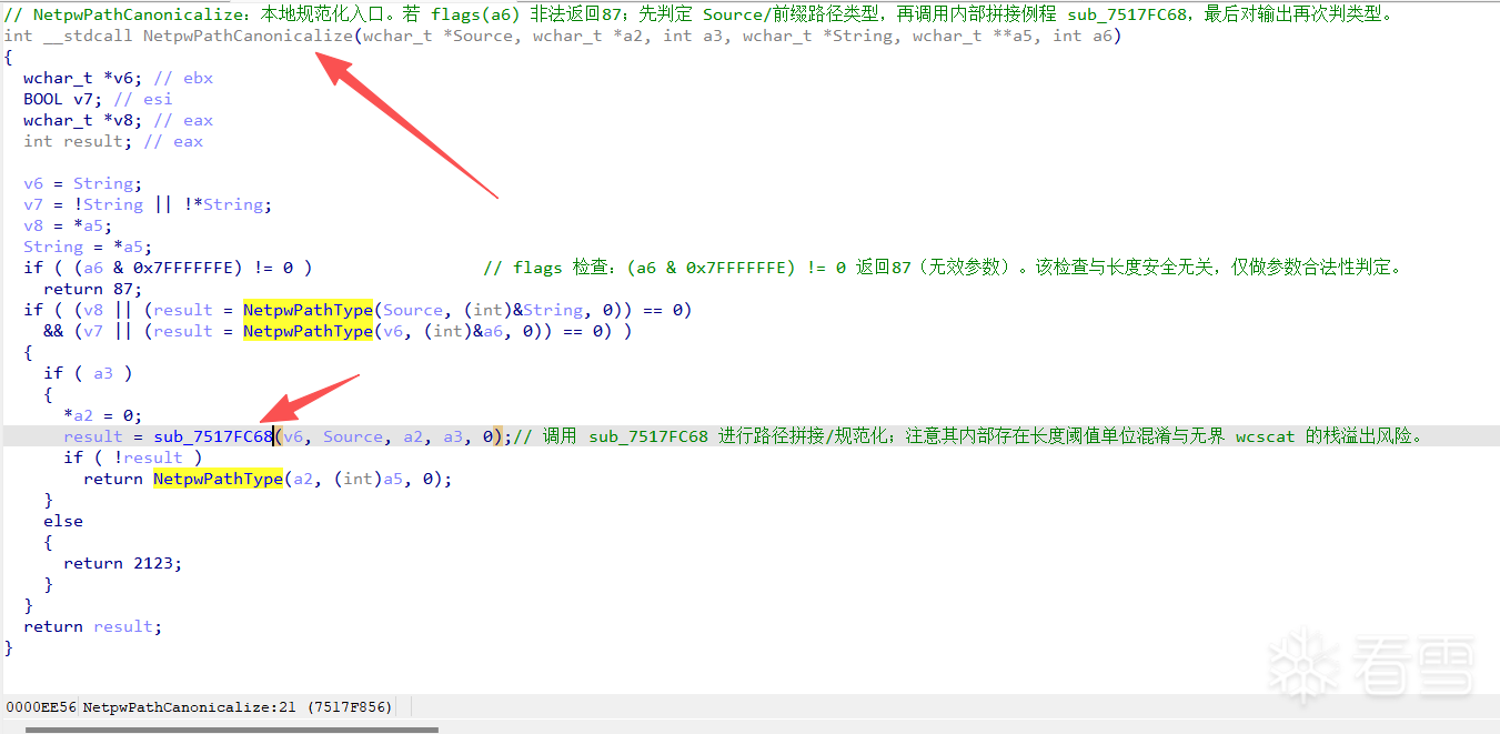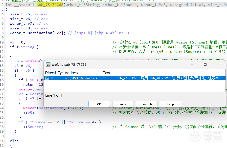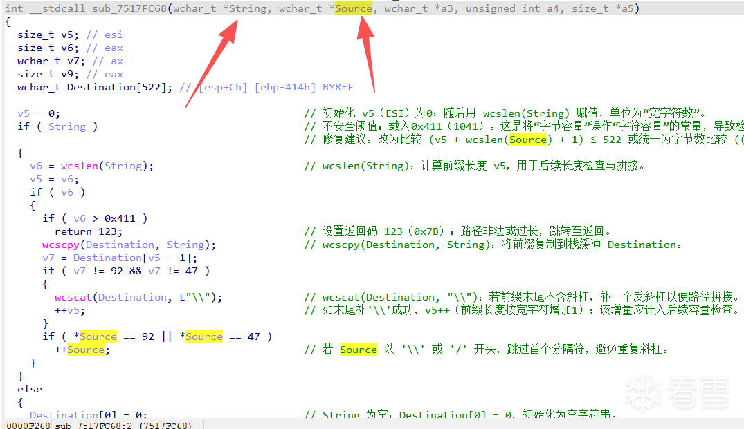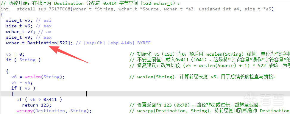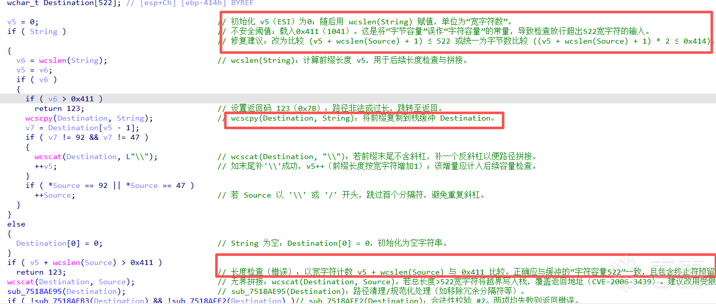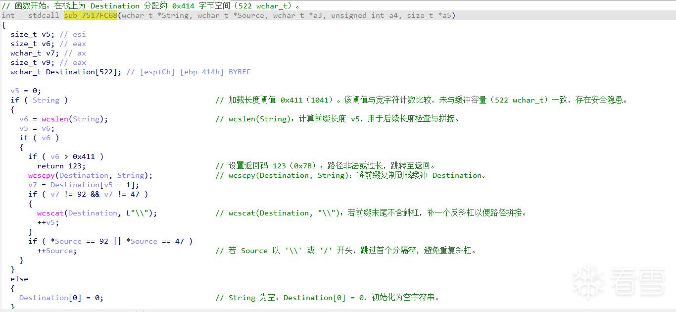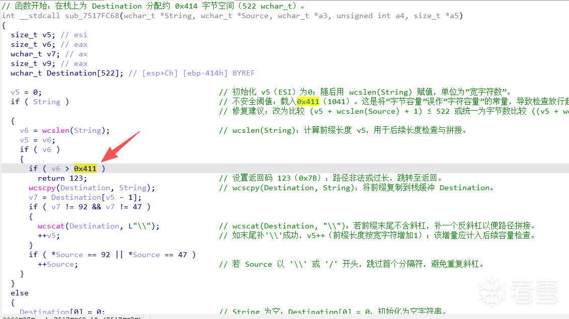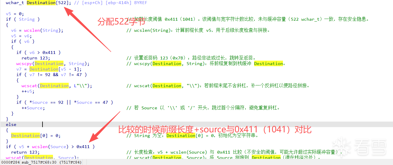 栈缓冲容量与检查阈值不匹配: 在 NETAPI32.DLL:0x7517fc6b 处为 Destination 分配 0x414 字节,即 1044 字节,等于 522 个 wchar_t 。 但长度检查在 NETAPI32.DLL:0x7517fcfe 比较的是 v5 + wcslen(Source) > 0x411 (1041 个宽字符)。 允许的最大长度被错误地设为 1041,而缓冲区只有 522,因此大量超长输入会“通过检查”,随后被无界拼接。