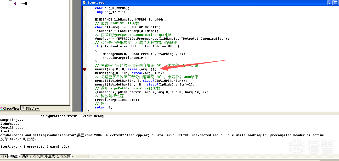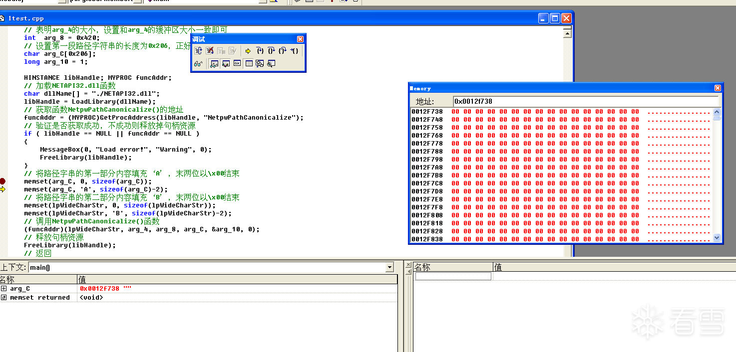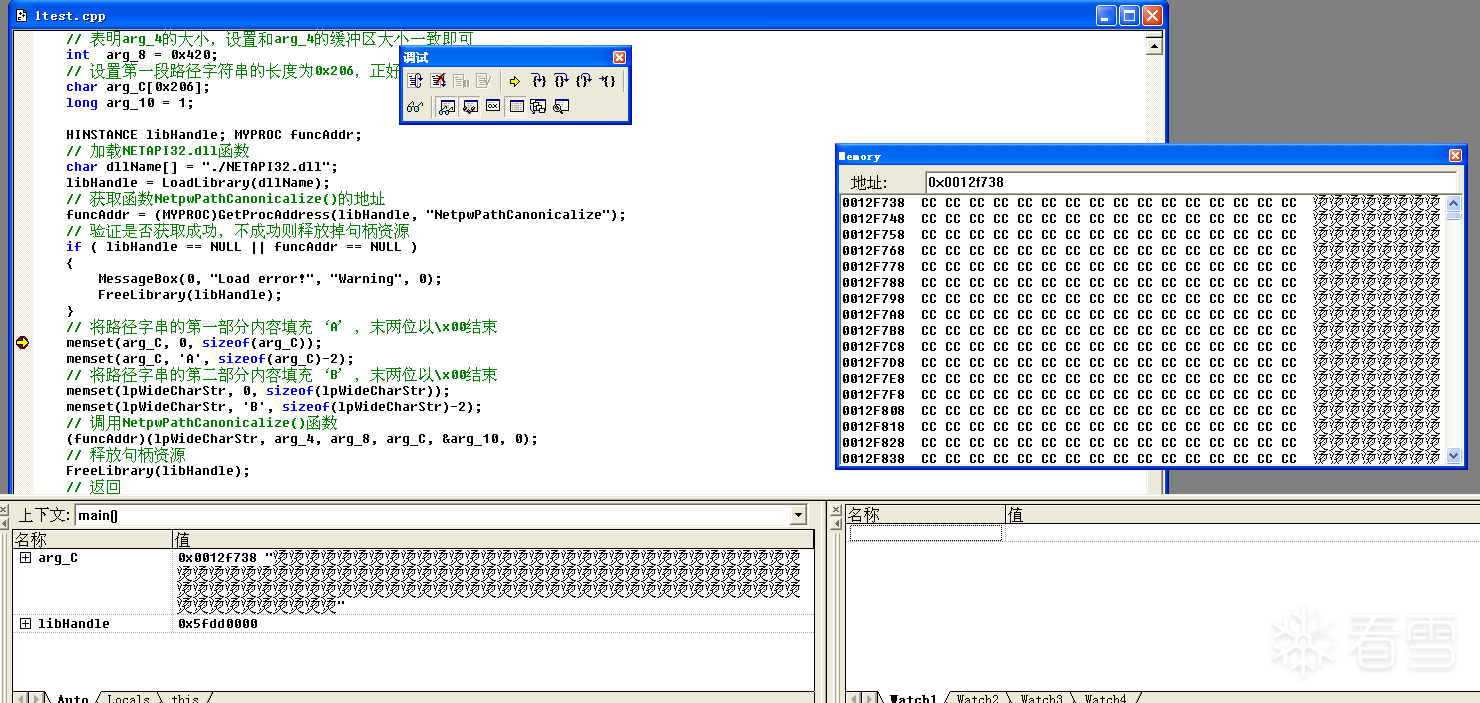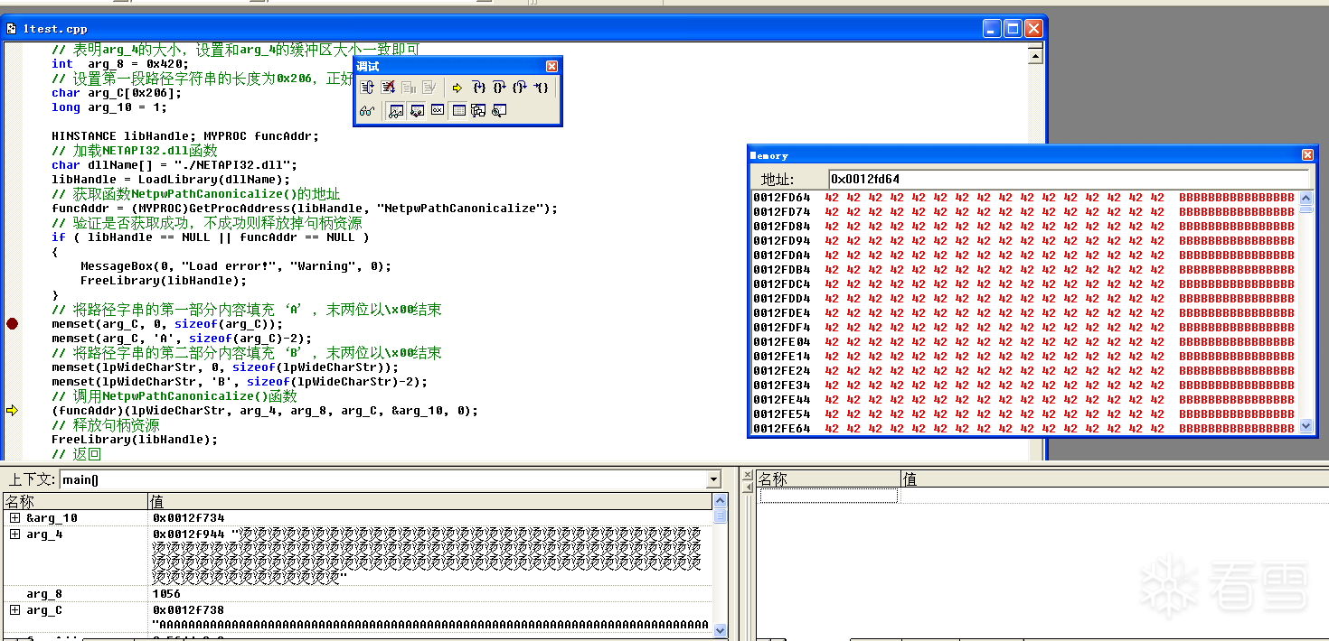 }总体思路就是 首先通过 LoadLibrary 加载 NETAPI32.dll,并以 GetProcAddress 取得 NetpwPathCanonicalize 入口;随后向第一参数写入 1052 字节“B”字符,第四参数写入 518 字节“A”字符。函数内部拼接后路径总长 0x622 字节,而输出缓冲区仅 0x414 字节,致使 0x20E 字节(526 字节)数据越界覆盖栈内关键结构,从而触发缓冲区溢出。