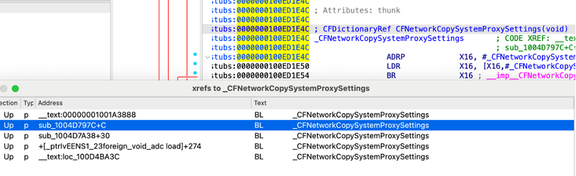 找到对 CFNetworkCopySystemProxySettings 函数的引用