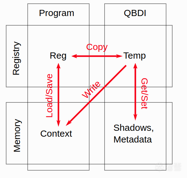 四. 更进一步观察细节: dbi意味着需要修改原始指令添加instrument代码,那么就需要创建新的内存空间容纳这些代码并且重定向 ,由于不可能事先处理整个二进制代码,因此需要运行时监视程序指令流,只处理真正需要执行的代码块。因此就引入了qbdi上下文和guest(我这里用虚拟化中的术语称之为guest) 上下文,这有点类似于qemu tcg中的用x86指令模拟arm指令运行时的上下文切换与指令处理技术,两者有些相通性,只不过qbdi运行在和guest一样的用户进程中,也因此带来了一些缺陷: trace框架本身用到的非重入性库函数可能会导致死锁,而且qbdi对目标程序属于弱控制,不像qemu或者java虚拟机可以完全控制目标的执行流。