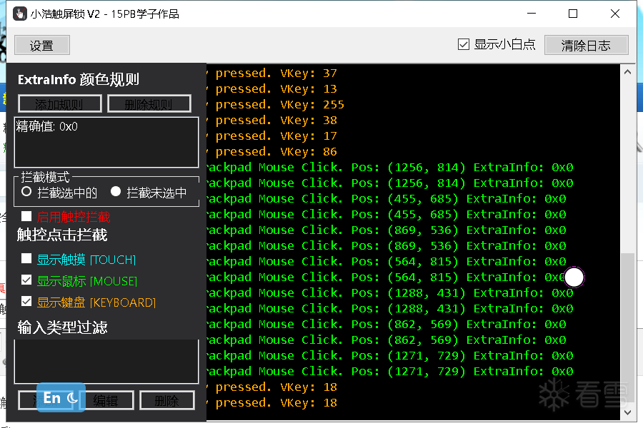 原理解释:USB鼠标的 ExtraInfo 值一般都是 0,我们添加规则 0 并选择「拦截未选中的」,就是告诉软件:只有 ExtraInfo=0 的输入(USB鼠标)允许通过,其他的(比如触摸屏,ExtraInfo≠0)都拦截掉。
