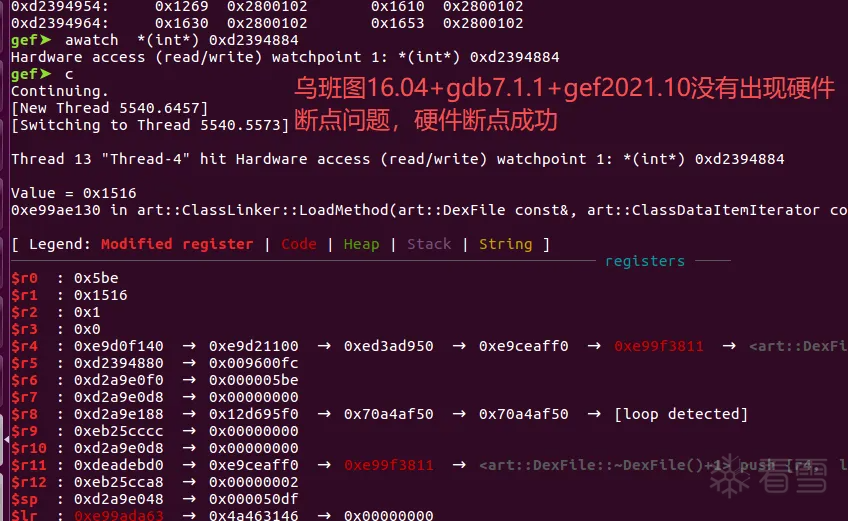 在使用gdb远程调试app,awatch硬件断点的时候,老是在awatch (int )0xd2212884之后,执行c运行这里卡住,偶尔会成功一次