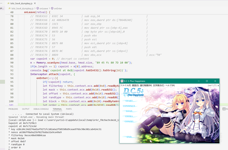 调试后可知hxv4的dll藏在exe资源文件中,去hook`LoadlibraryW`后可知他会在C盘生成类似于`krkr_xxx/yyy.dll`,hxv4相关的文件解密还有哈希函数都在里面,切入点如下: