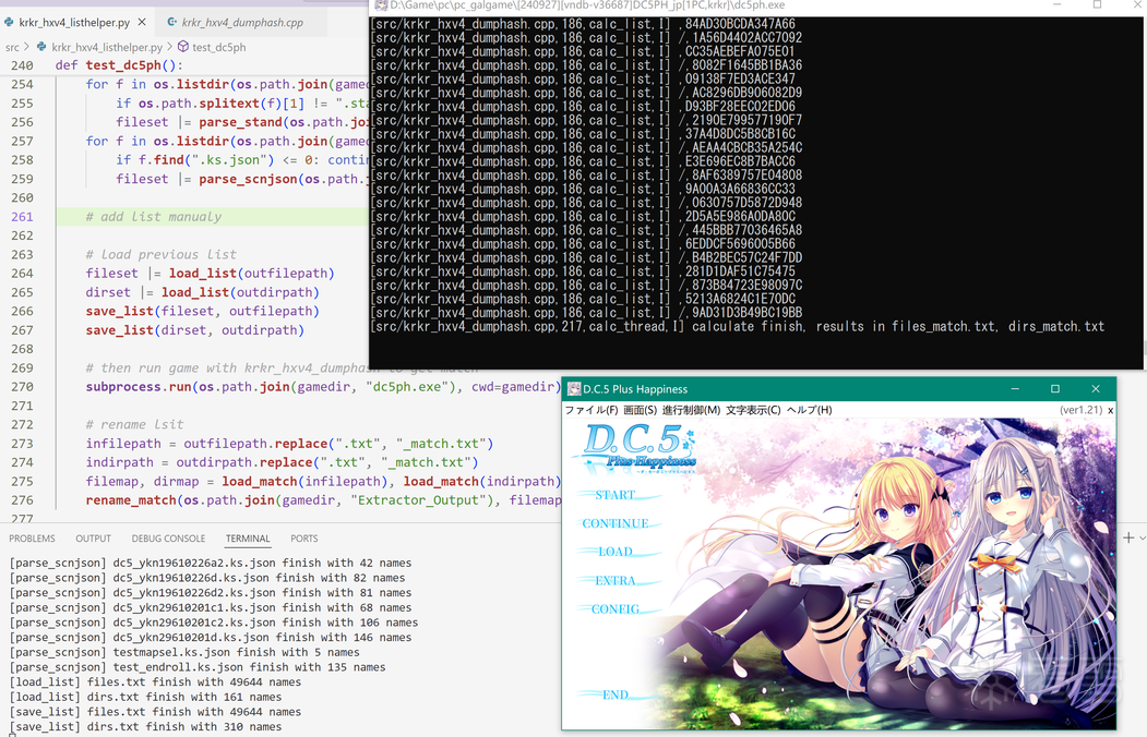目前主要有两种方案,运行时dump(krkrdump)、扫描对应的脚本构建字符串碰撞从而得到哈希值和文件名的映射([KrkrExtractForCxdecV2](549K9s2c8@1M7s2y4Q4x3@1q4Q4x3V1k6Q4x3V1k6Y4K9i4c8Z5N6h3u0Q4x3X3g2U0L8$3#2Q4x3V1k6k6k6f1I4A6K9$3g2K6M7%4y4Q4x3V1k6w2M7X3E0J5c8i4S2@1M7X3q4U0N6p5k6G2M7V1y4^5k6r3g2U0g2U0t1`.)+[krkr_hxv4_dumphash](95aK9s2c8@1M7s2y4Q4x3@1q4Q4x3V1k6Q4x3V1k6Y4K9i4c8Z5N6h3u0Q4x3X3g2U0L8$3#2Q4x3V1k6k6N6i4u0A6f1$3W2*7N6h3E0#2i4K6u0r3c8$3q4D9k6$3q4E0k6g2u0W2N6X3g2J5M7$3g2Q4x3V1k6T1L8r3!0T1i4K6u0r3L8h3q4K6N6r3g2J5i4K6u0r3M7s2u0G2K9X3g2U0N6q4)9J5c8X3E0J5K9%4u0Q4x3V1k6K6M7X3y4Q4x3V1k6C8M7X3E0J5i4K6g2X3K9s2S2$3y4q4)9#2k6X3c8#2L8i4m8Z5j5i4y4Z5i4K6u0W2j5%4m8H3))。本文将以`dc5ph`为例分析hxv4的哈希函数,以及如何还原对应的算法和数据结构。
