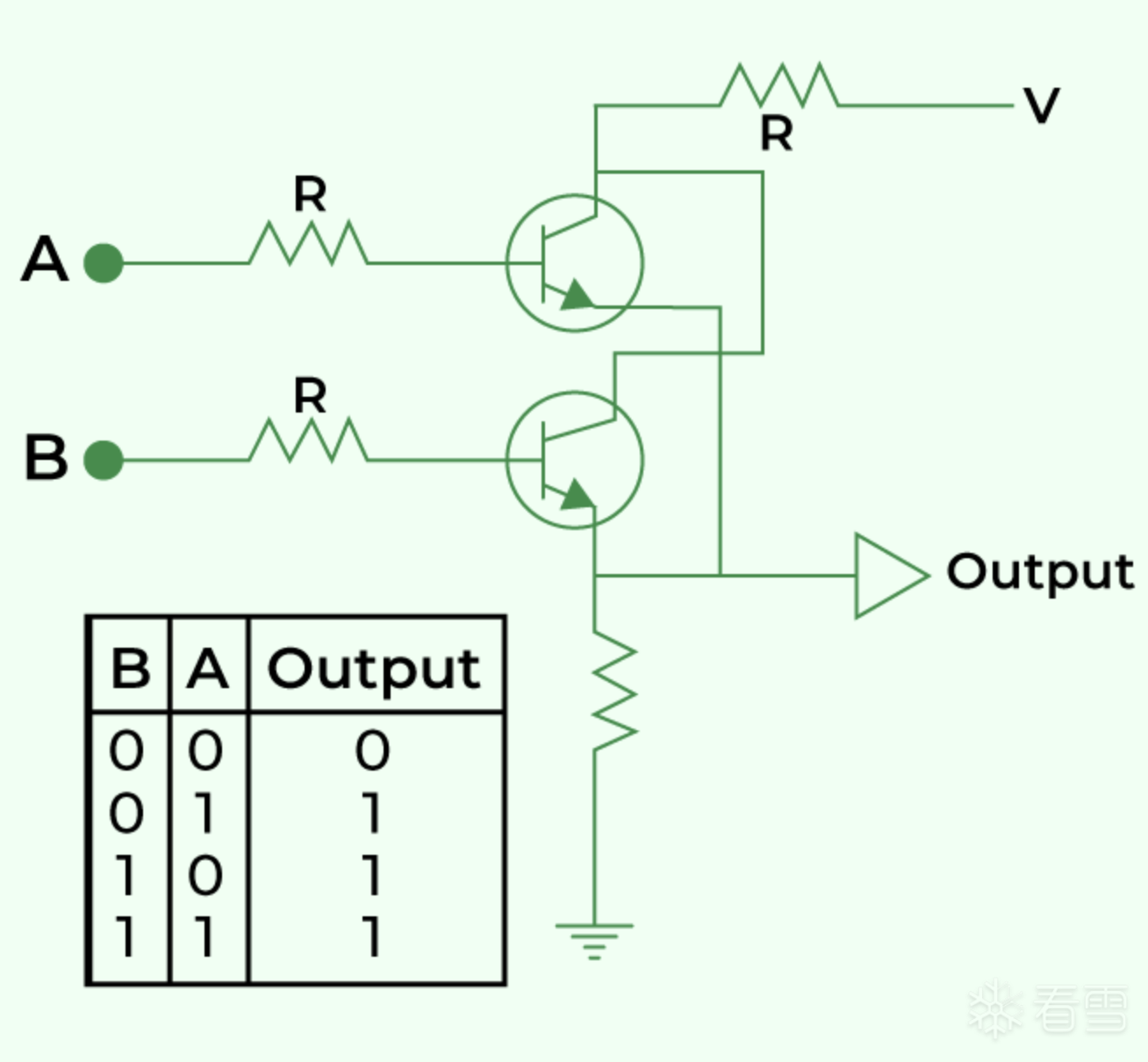 当任一晶体管基极接收到高电平输入时,电流便会流向输出端。
