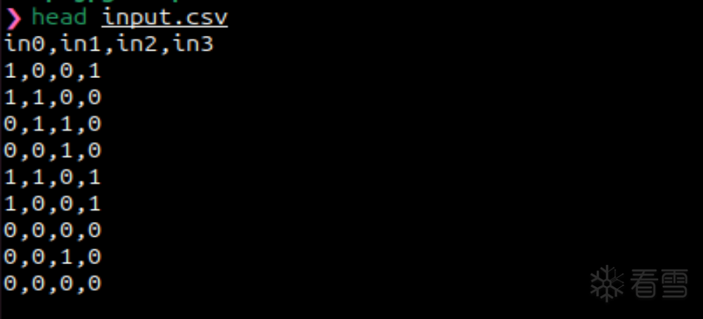 可以看到,这个csv文件中每一行都是in0到in3的输入值,但是没给出输出值,我们经过电路分析,已知了逻辑关系,或许可以用python脚本计算出对应到OUT0序列是什么。