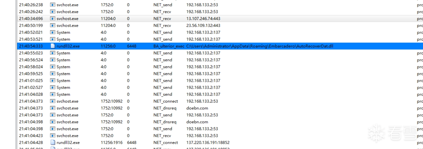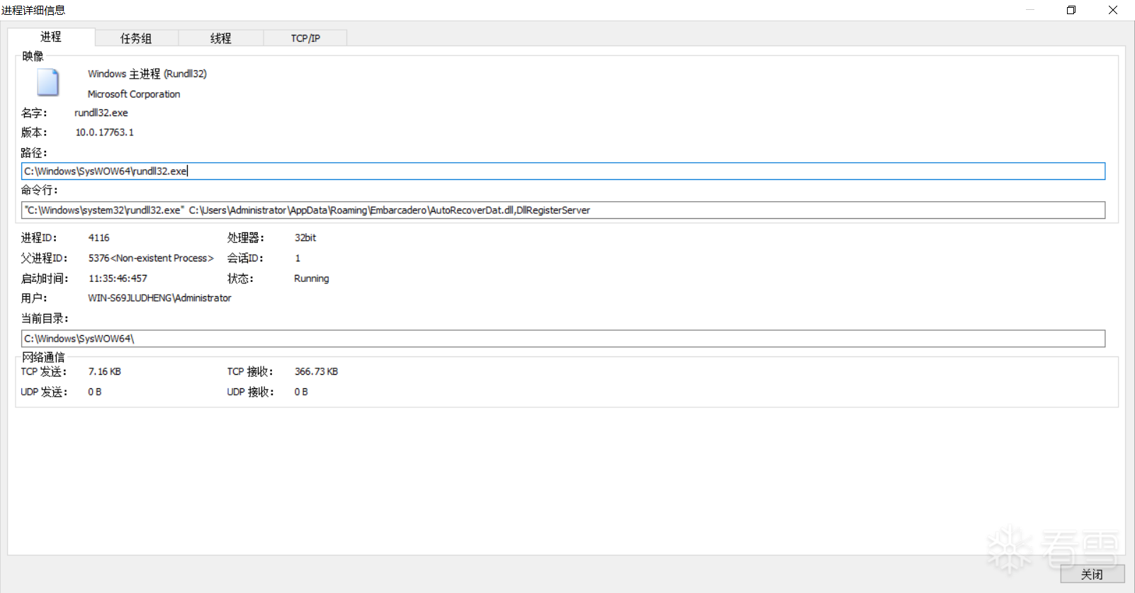 安装完毕后,进程列表中新增了一个名为 rundll32.exe 的进程,这引起了高度警觉。通过查看其命令行参数,发现了明显的恶意行为特征: "C:\Windows\system32\rundll32.exe" C:\Users\Administrator\AppData\Roaming\Embarcadero\AutoRecoverDat.dll,DllRegisterServer