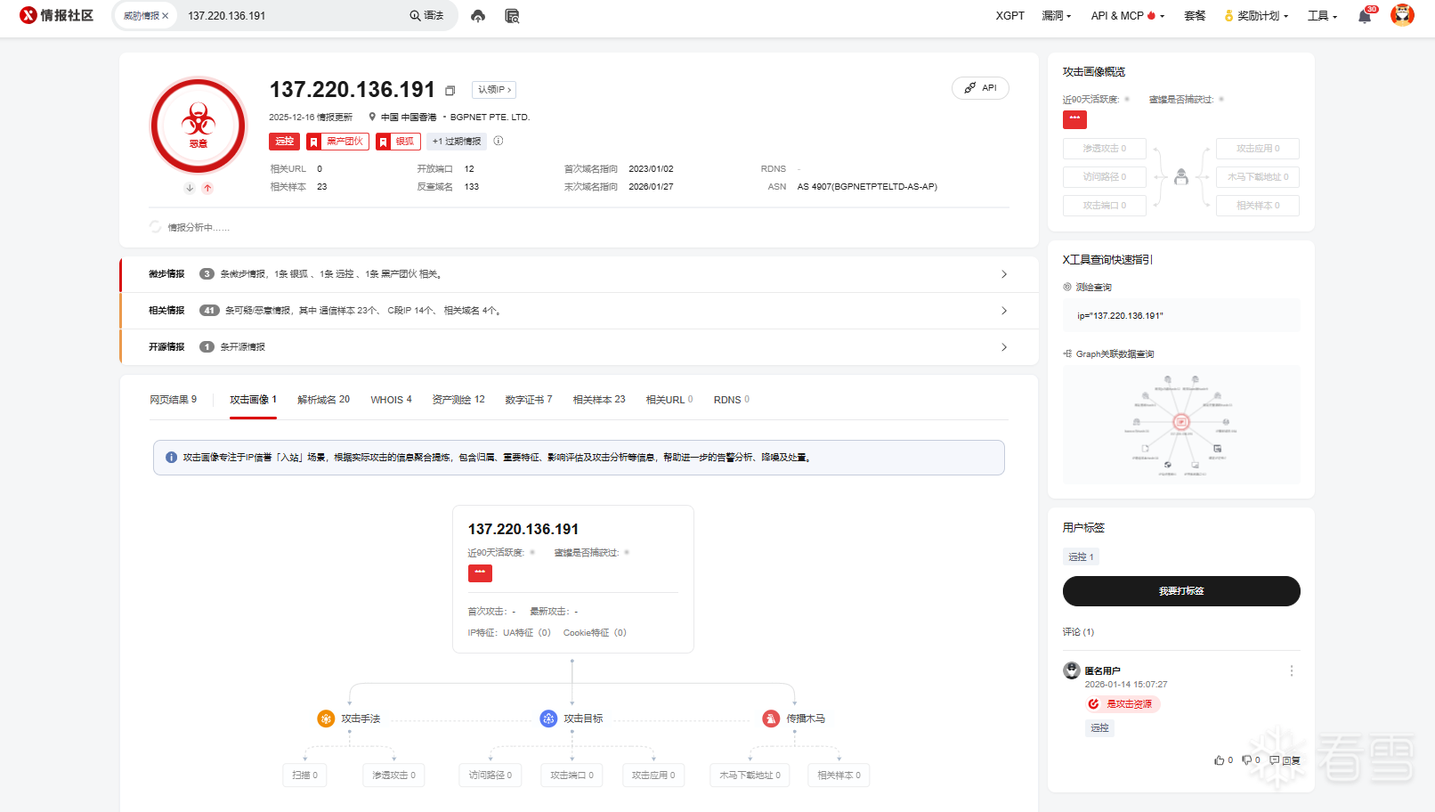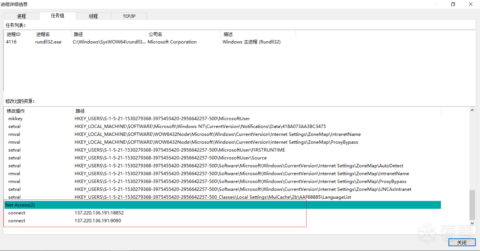 接着,通过网络连接监控发现,该 rundll32.exe 进程正持续连接 IP 地址:137.220.136.191。使用威胁情报中心关联分析,确定该 IP 为银狐组织的 C2 控制端。