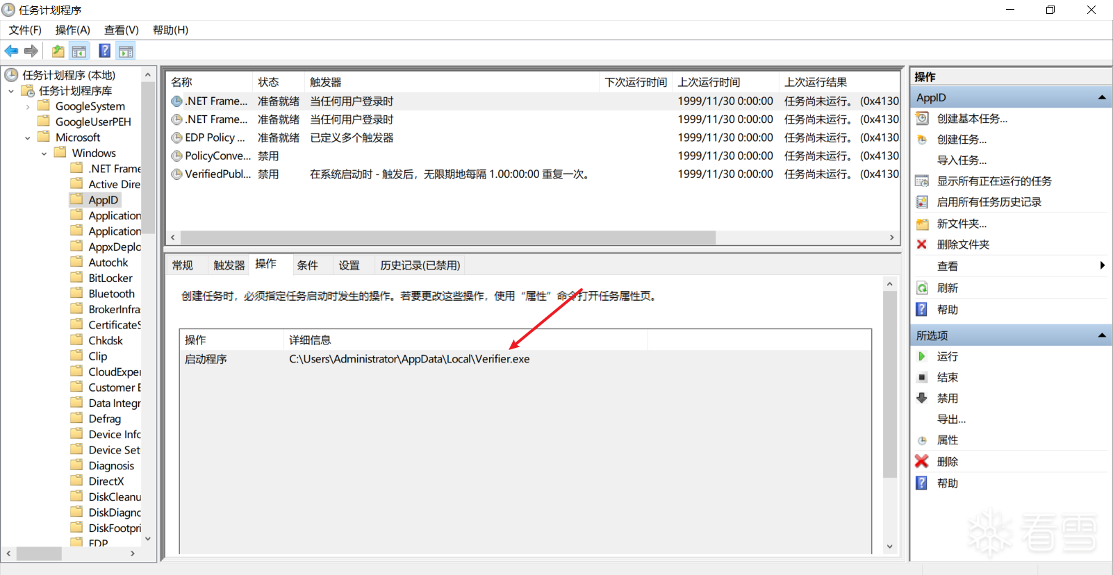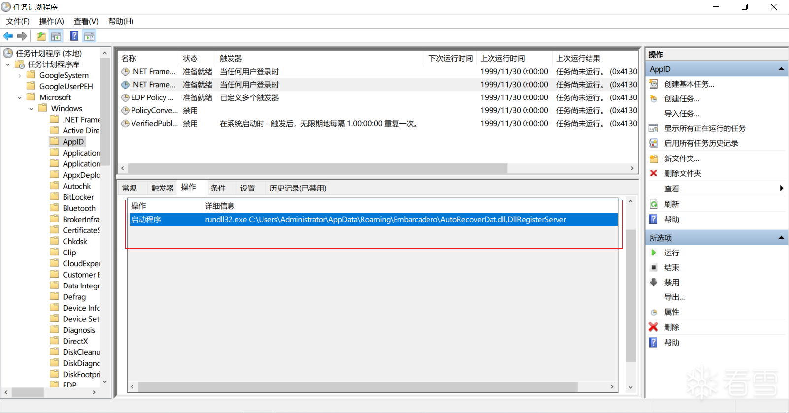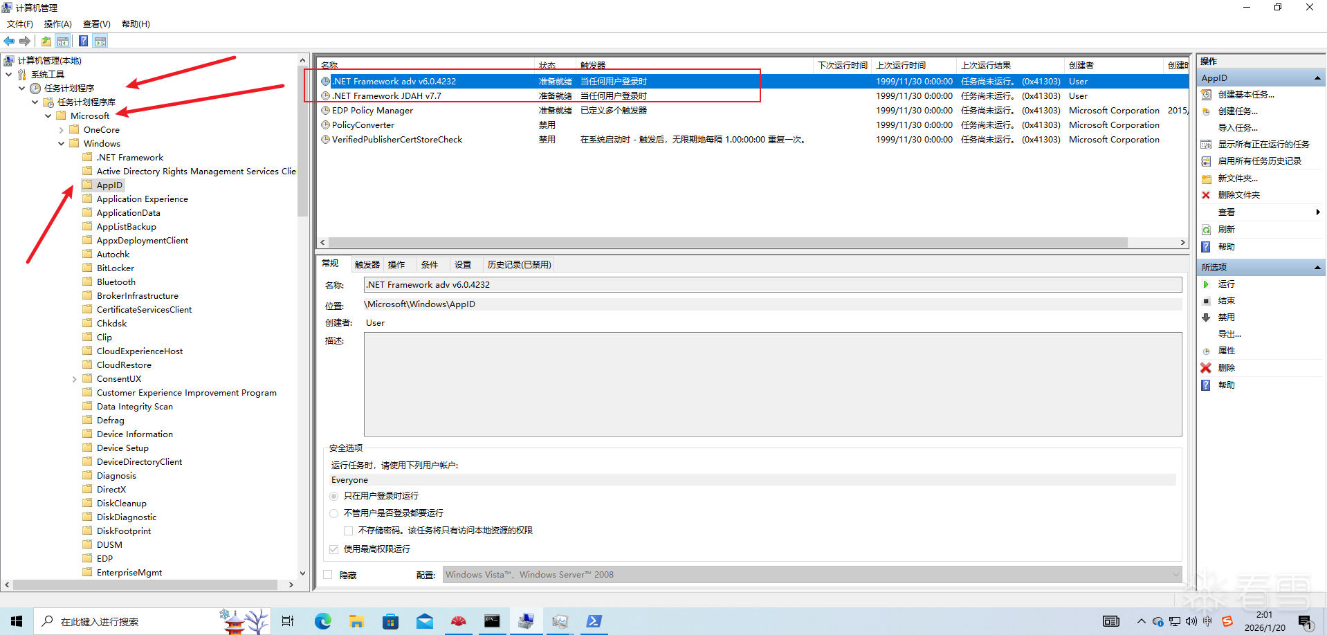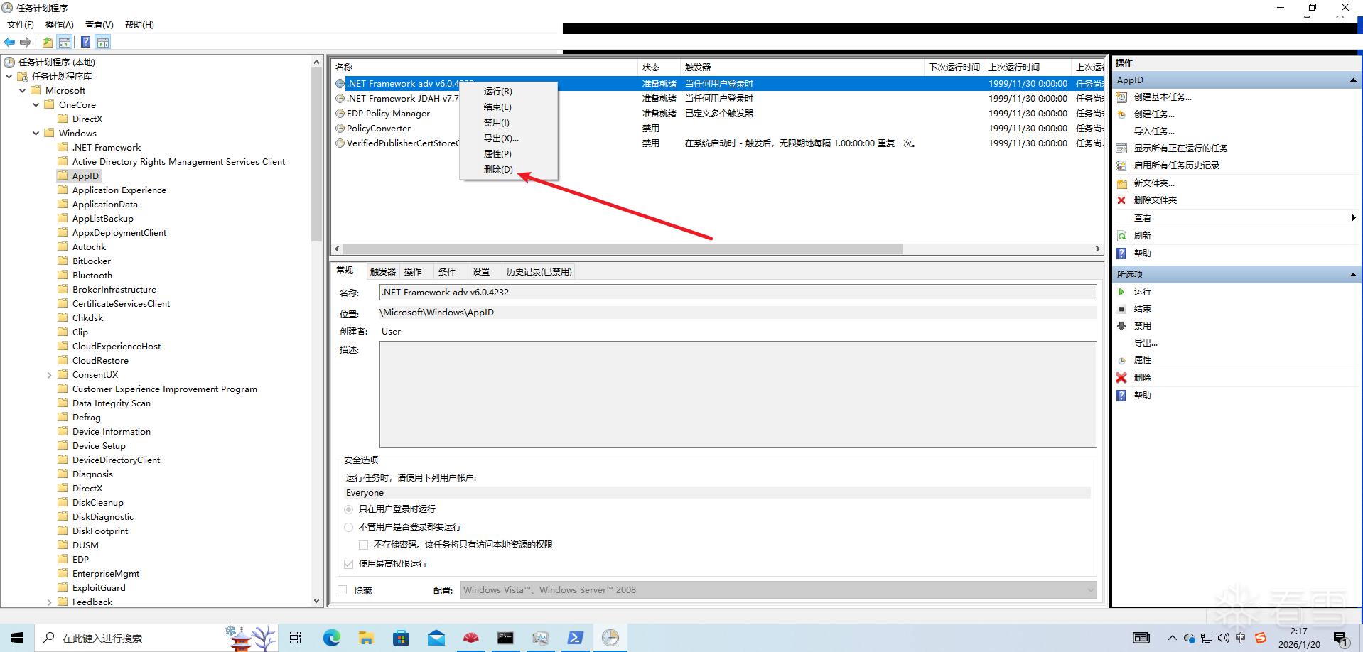 根据输出结果,打开 taskschd.msc,导航至 \Microsoft\Windows\AppID\ 路径,右键删除名为 .NET Framework JDAH v7.7 和 .NET Framework adv v6.0.4232 的任务。