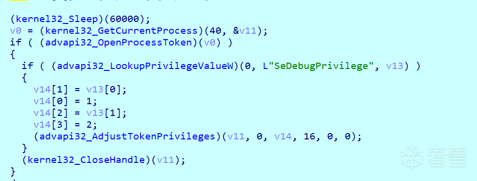 核心行为:获取当前进程令牌,并为自身提升 SeDebugPrivilege(调试特权)。