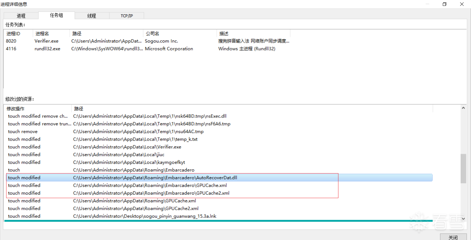 随后进一步跟进了这个 rundll32.exe 的任务组,发现它确实与搜狗输入法安装程序存在父子或关联关系,且在后台静默创建和释放了大量文件。